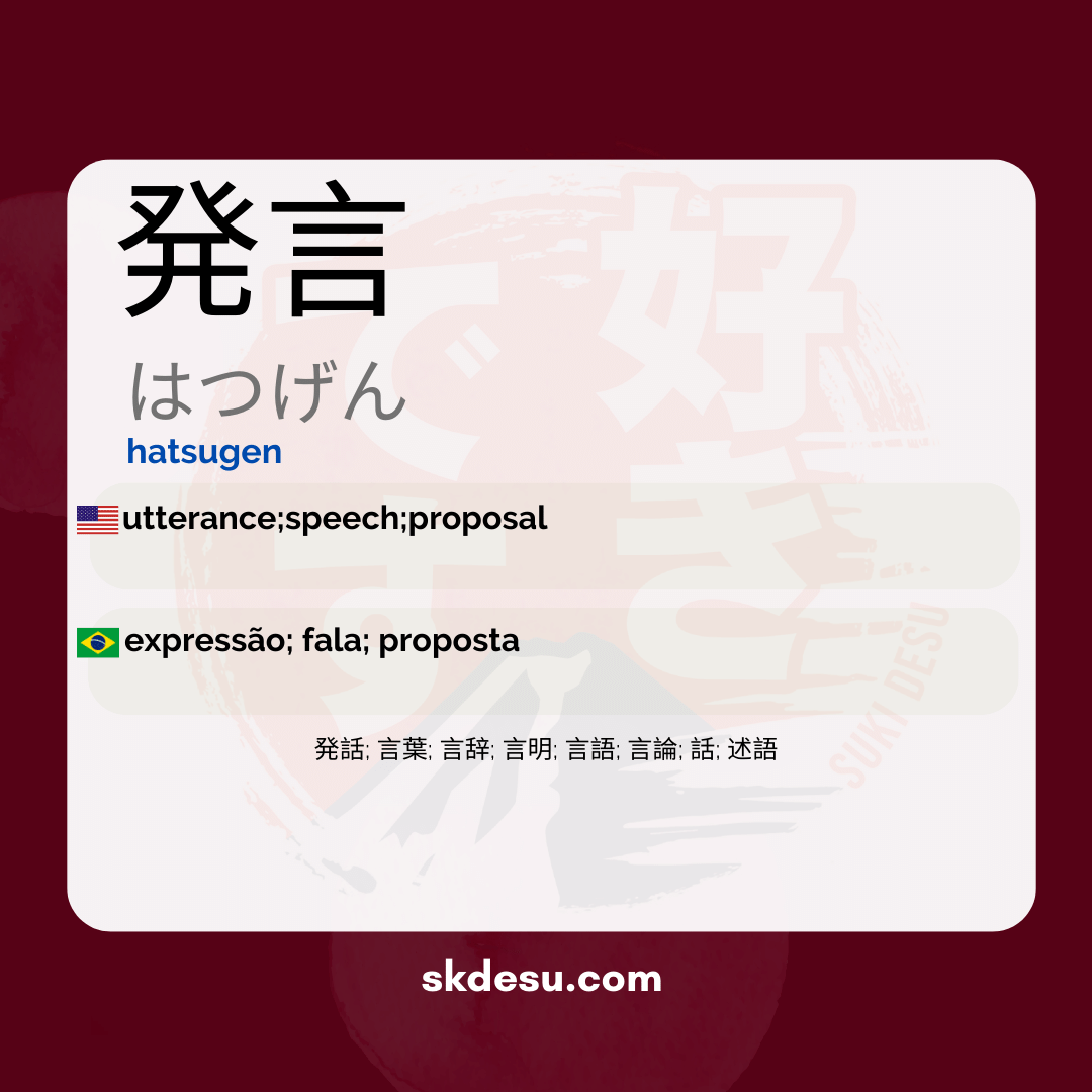 A palavra japonesa 「発言」 (hatsugen) é bastante utilizada no dia a dia para se referir a declarações, falas ou pronunciamentos. Sua etimologia revela muito sobre seu significado e usa no cotidiano. Composta pelos kanji 「発」 (hatsu), que significa "emergir" ou "produzir", e 「言」 (gen), que expressa "falar" ou "palavra", sua junção transmite a ideia de “exprimir em palavras” ou “manifestação verbal”.
