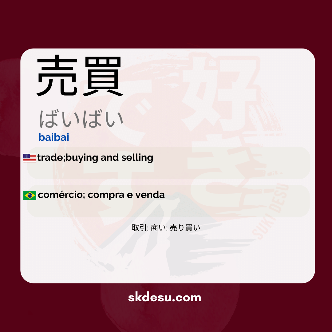 คำศัพท์ภาษาญี่ปุ่น 「売買」 (baibai) ประกอบด้วยตัวคันจิสองตัว: 「売」 (bai) ซึ่งหมายถึง "ขาย" และ 「買」 (kai) ซึ่งหมายถึง "ซื้อ" การรวมกันของตัวอักษรเหล่านี้ส่งผลให้เกิดวลี "การซื้อและขาย" ซึ่งหมายถึงการทำธุรกรรม โดยการแลกเปลี่ยนบางสิ่งกับมูลค่าเงินในบริบททางการค้า การใช้ตัวคันจิทั้งสองตัวร่วมกันเน้นความสัมพันธ์ระหว่างสองกิจกรรมซึ่งเป็นสิ่งพื้นฐานสำหรับการค้า