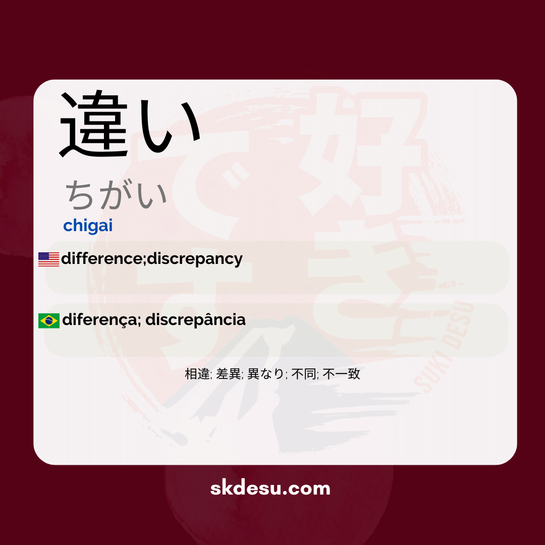 คำว่า 違い หมายถึง "ความแตกต่าง" หรือ "การเบี่ยงเบน" และใช้เพื่อเปรียบเทียบสองสิ่งหรือมากกว่านั้น โดยเน้นที่สิ่งที่ทำให้มันแตกต่างกัน เช่นเมื่อกล่าวว่า この二つは大きさの違いがある (kono futatsu wa ookisa no chigai ga aru) คุณกำลังบอกว่ามีความแตกต่างในขนาดระหว่างสองรายการ เป็นคำที่ใช้งานได้หลากหลาย ทั้งในบทสนทนาไม่เป็นทางการและในบริบทที่เป็นทางการมากกว่า